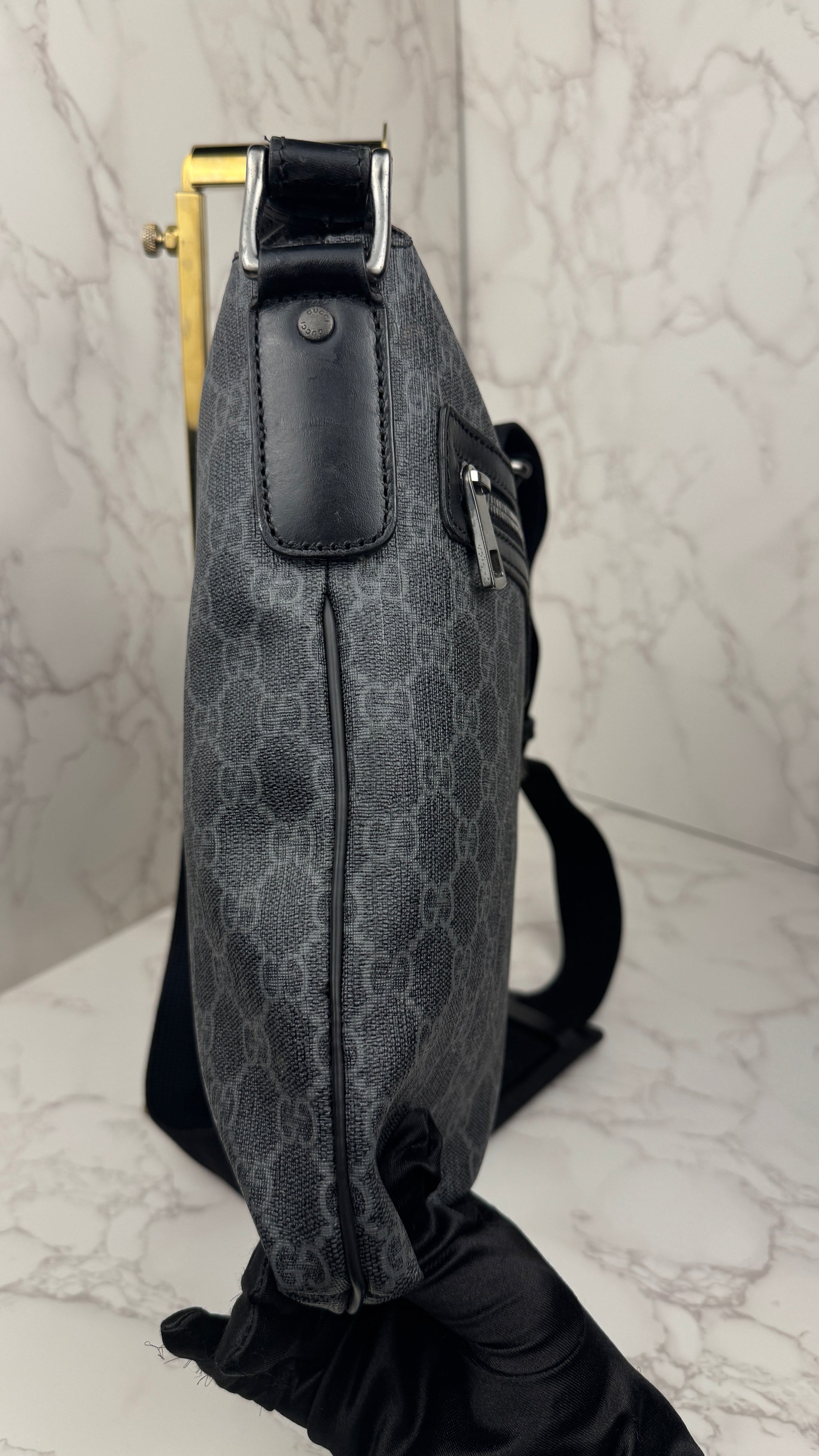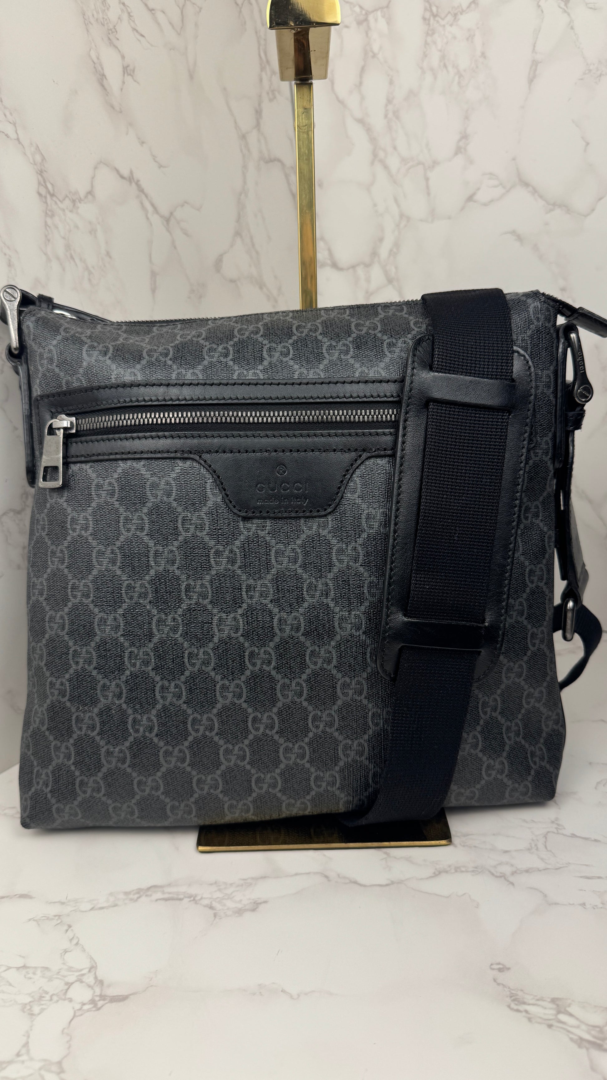 Authentic Gucci GG Supreme Canvas Crossbody Bag featuring the iconic GG monogram in a classic dark gray/black colorway.