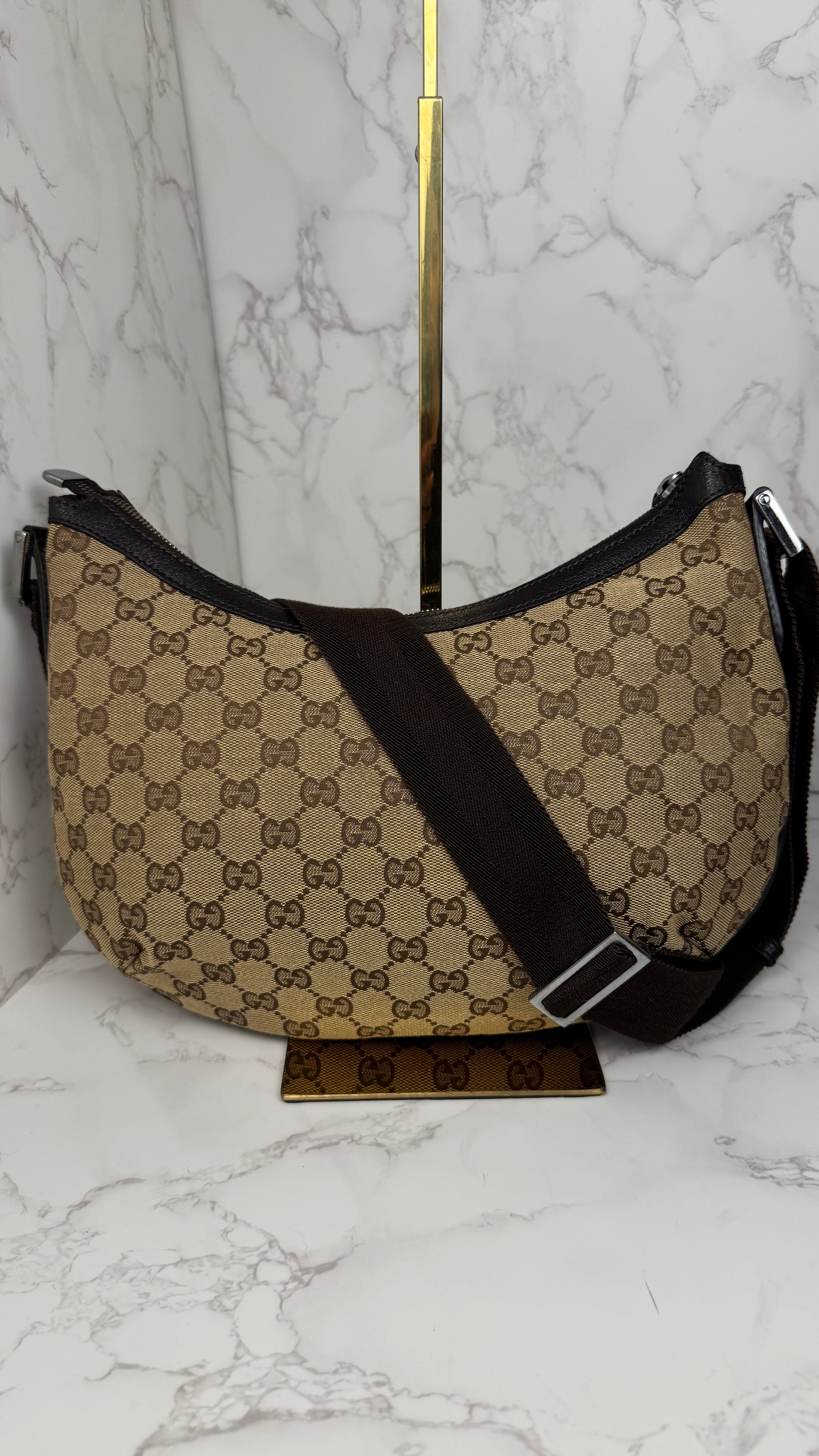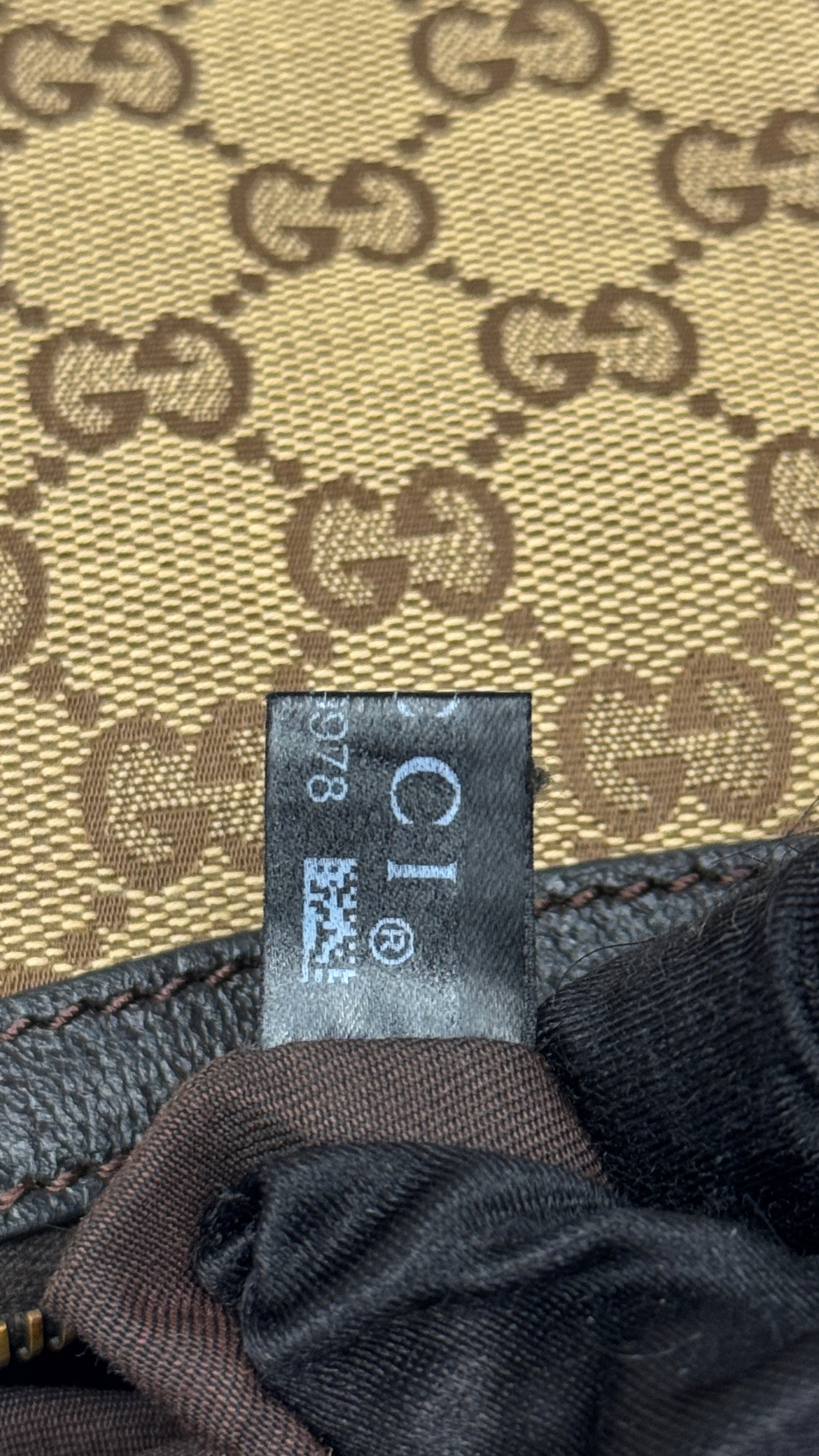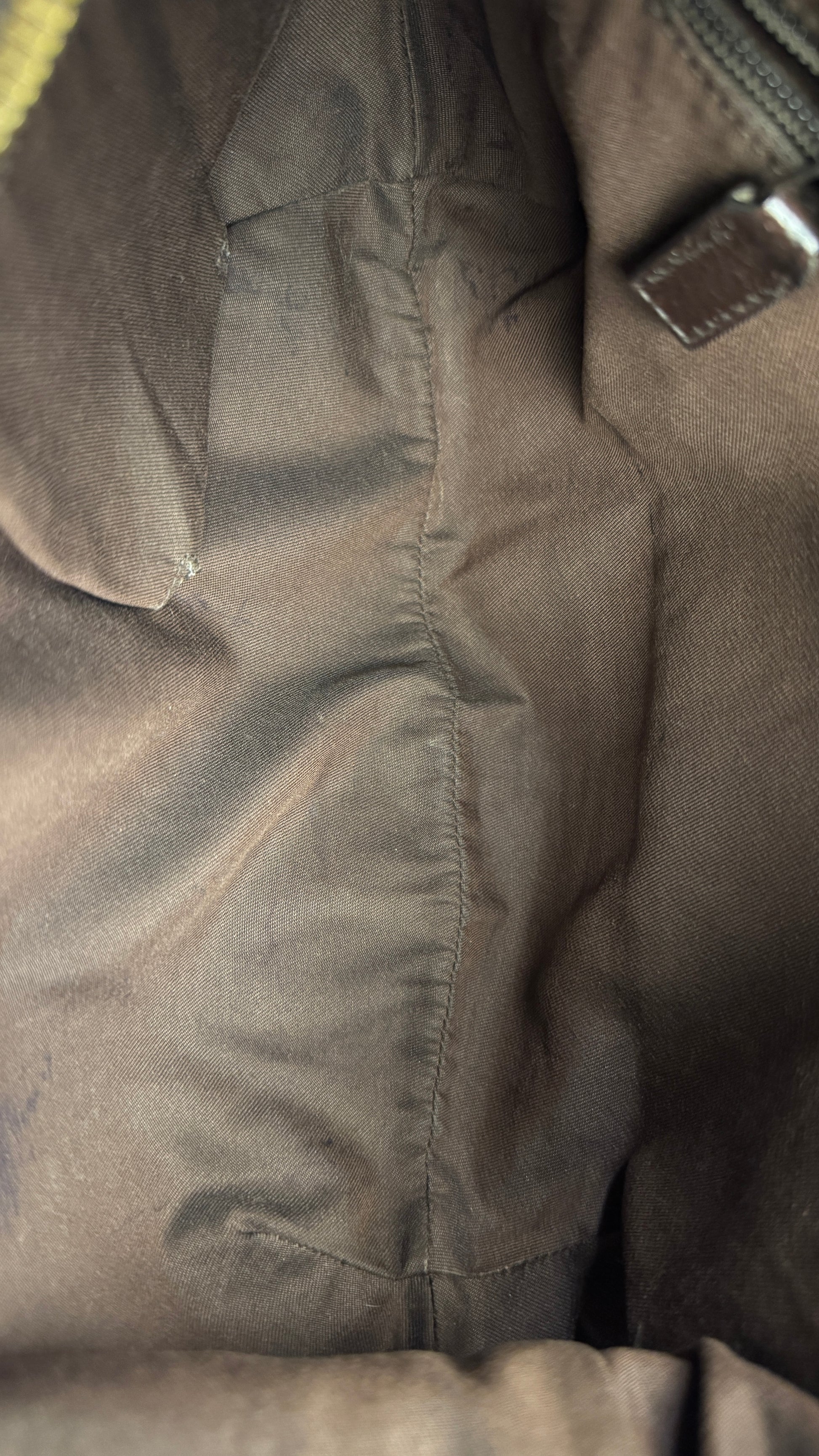 Pre-owned. Canvas shows visible wear. Strap has noticeable wear. Interior shows stains and signs of use. Hardware functional. Overall good, used condition.
