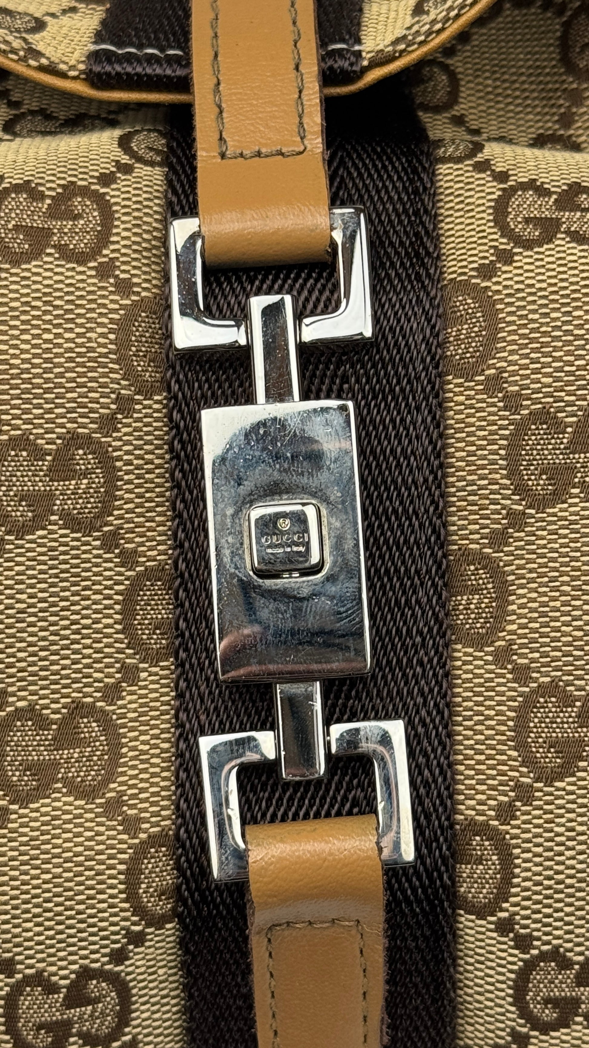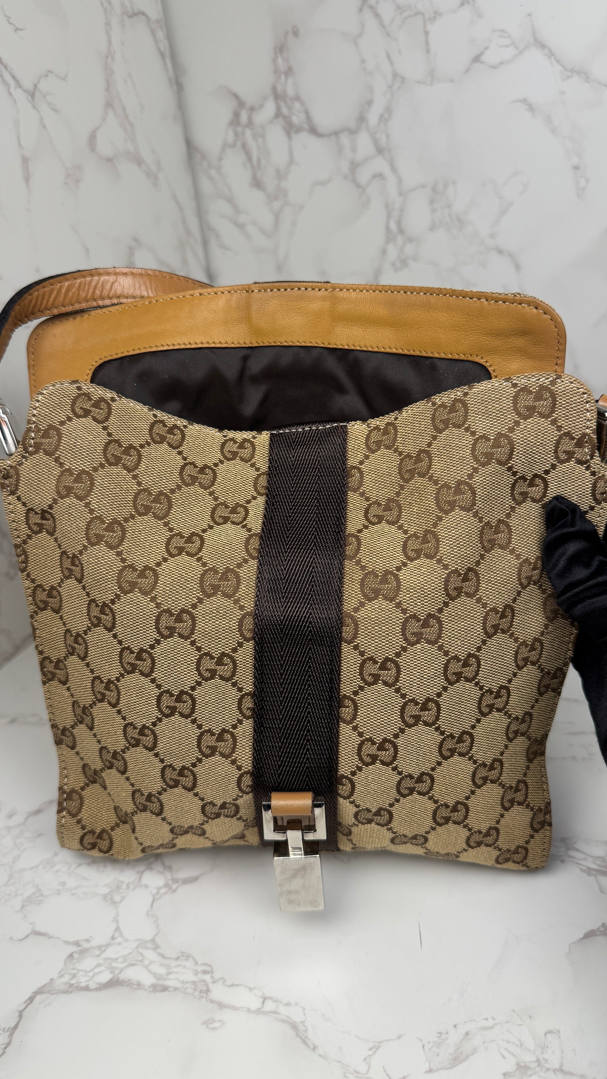 Pre-owned. GG canvas is clean with light signs of use. Leather trim and strap show gentle wear and natural creasing. Interior lining has light marks from use. Hardware functions properly. Overall well maintained.