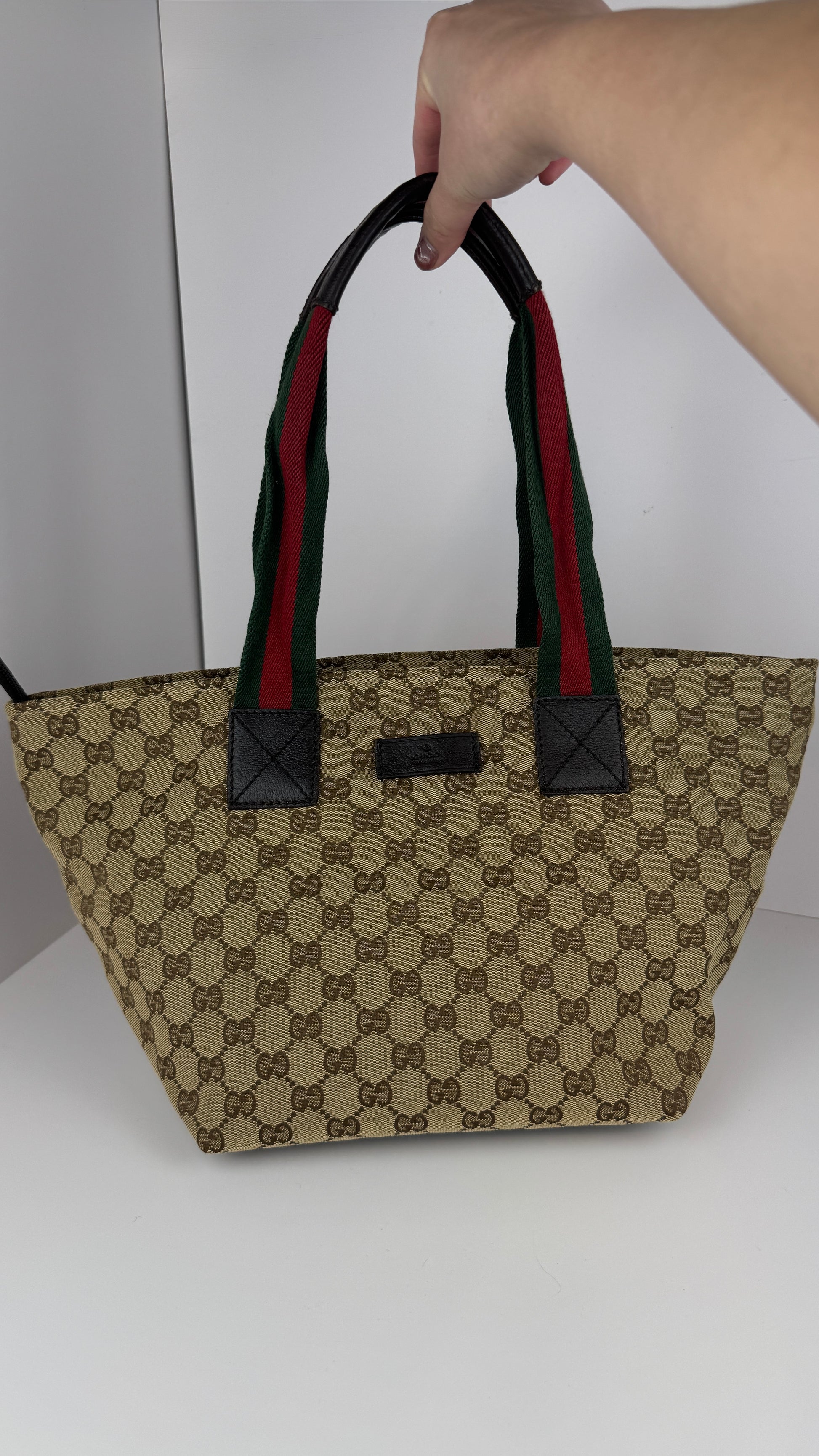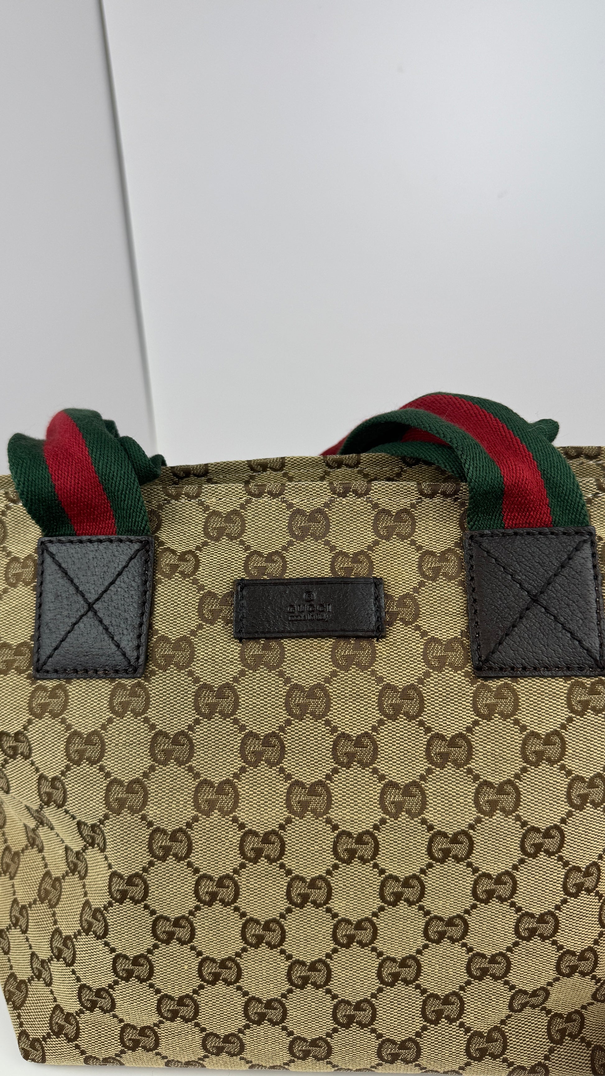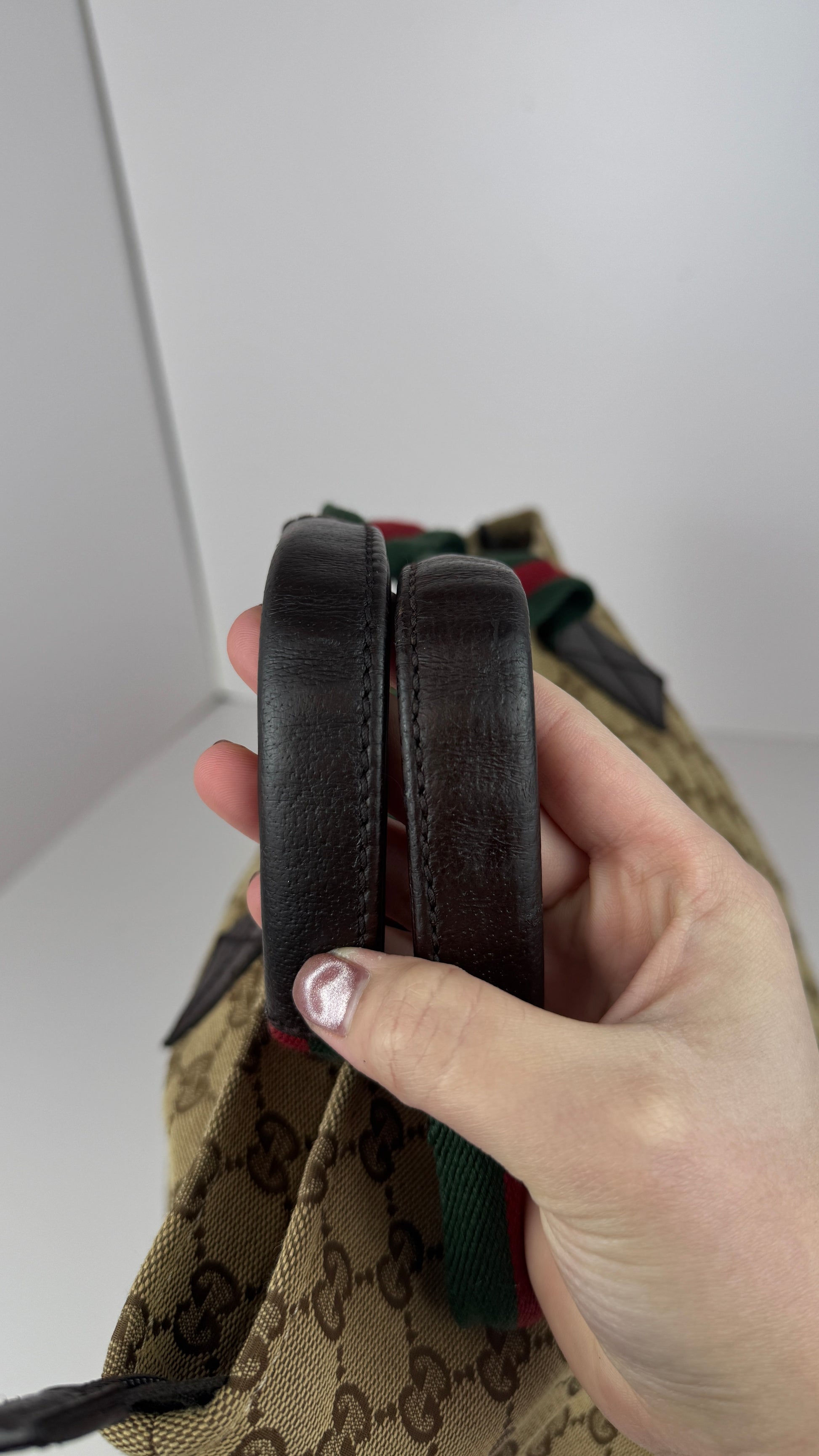 GG canvas is clean with minor signs of use. Leather base and trim show light wear and creasing consistent with normal use. Web canvas handles have light fuzzing/wear. Interior lining is clean with light wrinkles, no stains or odors. Overall bag remains sturdy and fully functional.