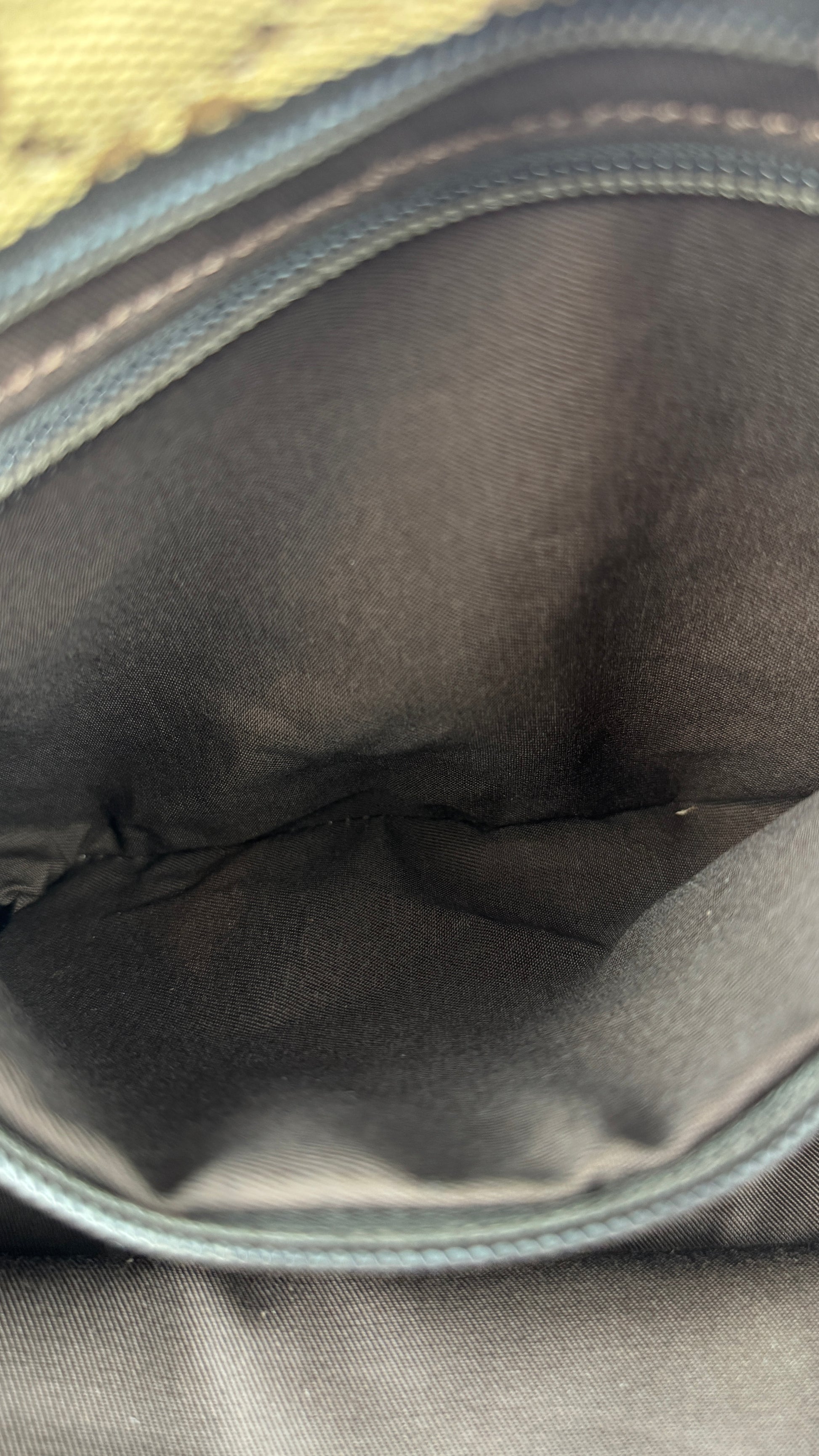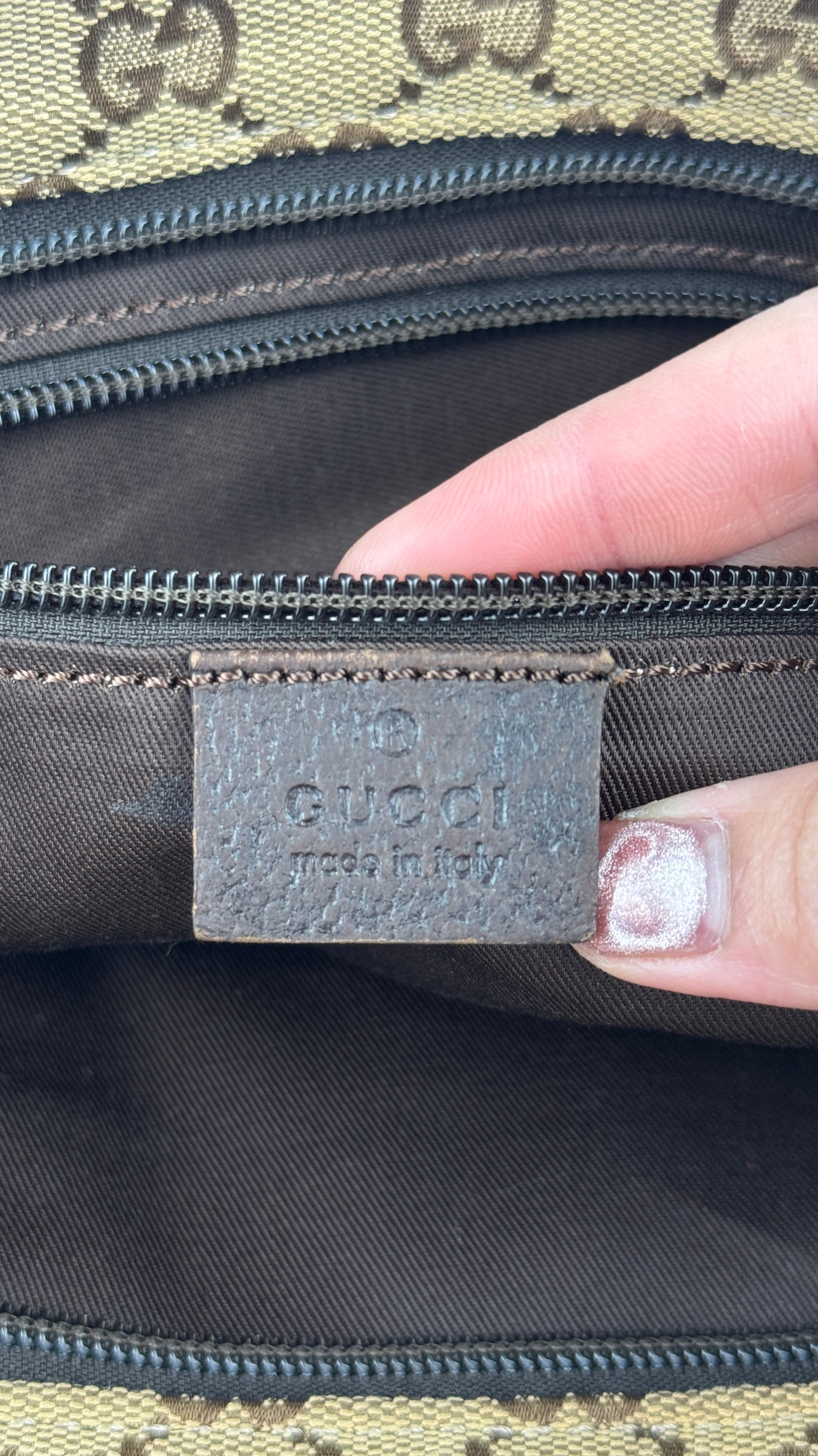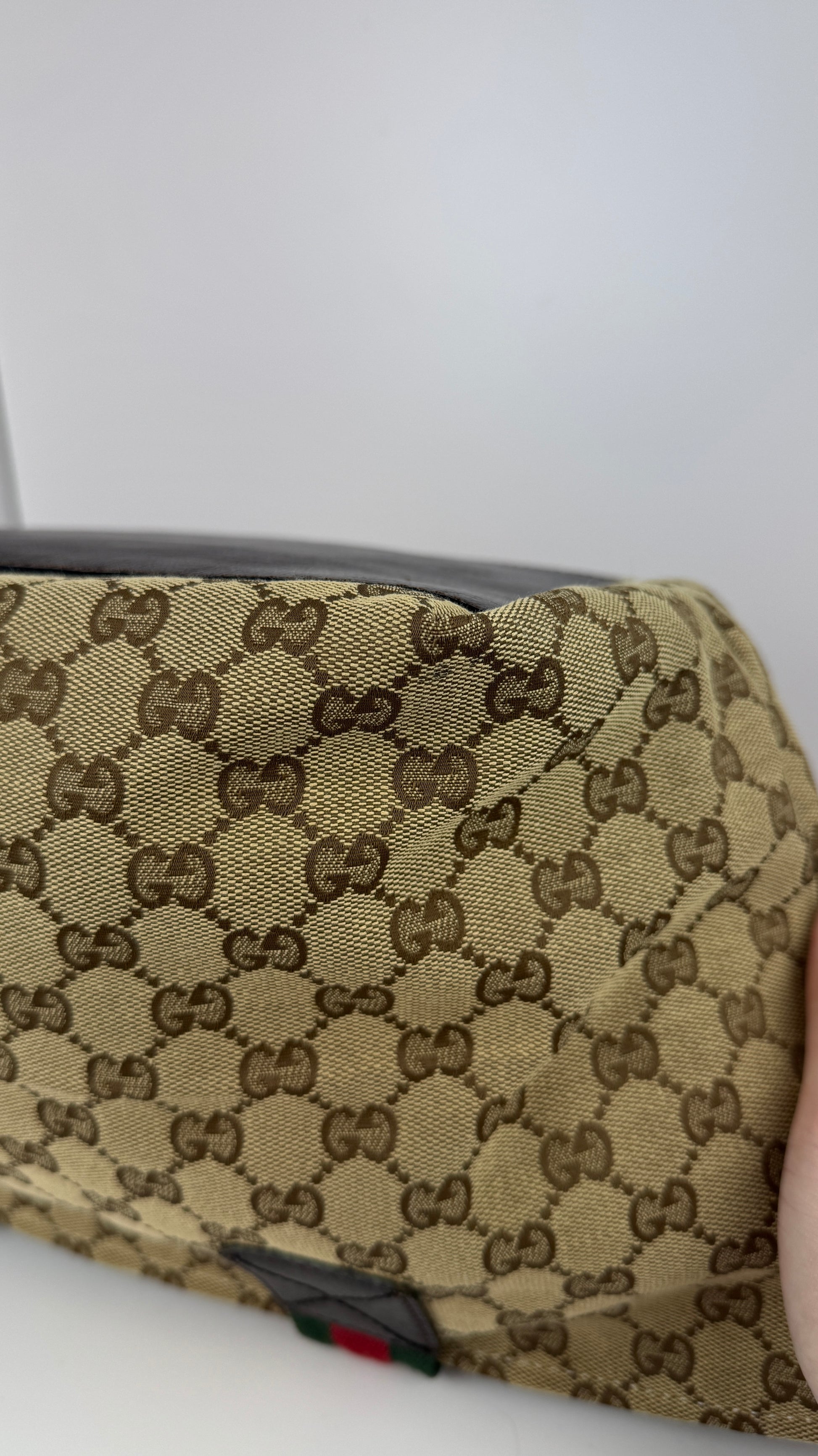 GG canvas is clean with minor signs of use. Leather base and trim show light wear and creasing consistent with normal use. Web canvas handles have light fuzzing/wear. Interior lining is clean with light wrinkles, no stains or odors. Overall bag remains sturdy and fully functional.